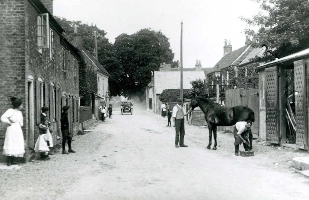 Photo: East Street, Farrier at work | Looking east along East St c1910 where the future roars towards the village centre – a horseless carriage carries 5 passengers in a cloud of dust. Fred Macey is seen with Jim Bucksey in front of his forge. Note the street lamp and flag pole located outside the Court House.