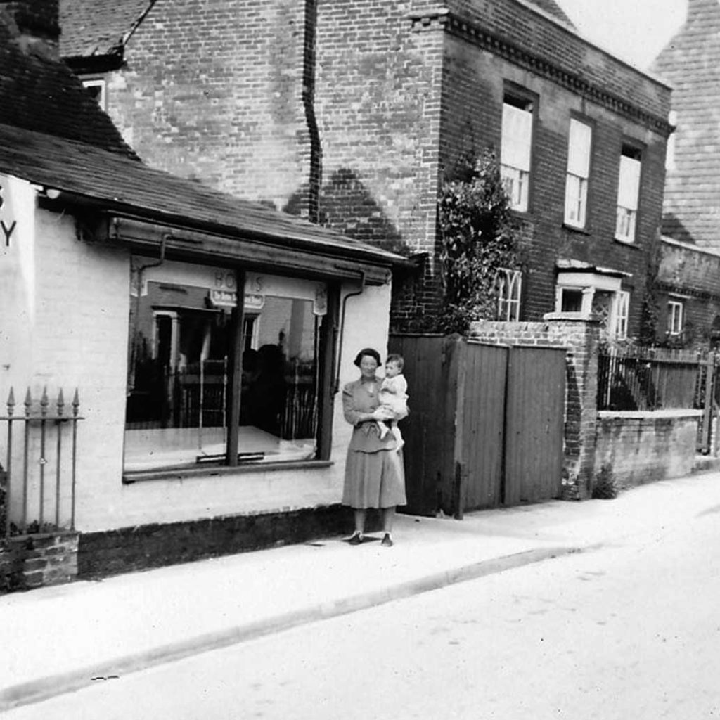 Photo: Beames Bakery, Hazeldene, East Street | Jean Beames holds granddaughter Isobel in front of the shop. Myrtle Bank, beyond shows the addition of a parapet to create a Georgian-style frontage.