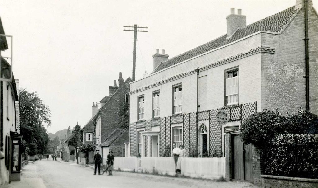 Further along East Street on the north side is the Red House. In the 1930’s this establishment was named Olde Folly Tea Room; it also served teas in the garden and the spacious indoor café ran tea dances for the village’s bright young things. Patrons from near and far entered the Tea Garden via Church Lane but the café and servants’ entrance was on East Street.  Villager Kath Graham remembered, as a youngster, standing by May’s sweet shop across the road and the excitement of watching people come and go.
