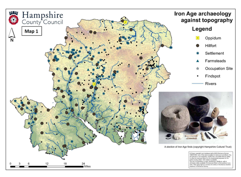 During this period Britain experienced immigration of Celtic tribes from north and central Europe. It is likely that inhabitants in the vicinity of ancient Hambledon included these Celtic migrants and it is thought that the name Meon may be a Celtic legacy. Whatever their cultural characteristics – widely associated with particularly decorative arts – they brought key social and economic developments to the Bronze Age environment. These included such features as hill forts, and the oppidum – an enclosed settlement often marked out by ditches and dykes. They also brought their technical knowledge of ironworking. The map (below) from Atlas of Hampshires Archaeology shows the numerous hill forts close to Hambledon’s location, the nearest being Old Winchester Hill. Oppida are shown on this map and they formed the nucleus of future Roman cities at Winchester, Chichester and Silchester. Oppida hosted early industry and formed social and economic infrastructure for regional rule; often they were home to a mint producing local coinage.
